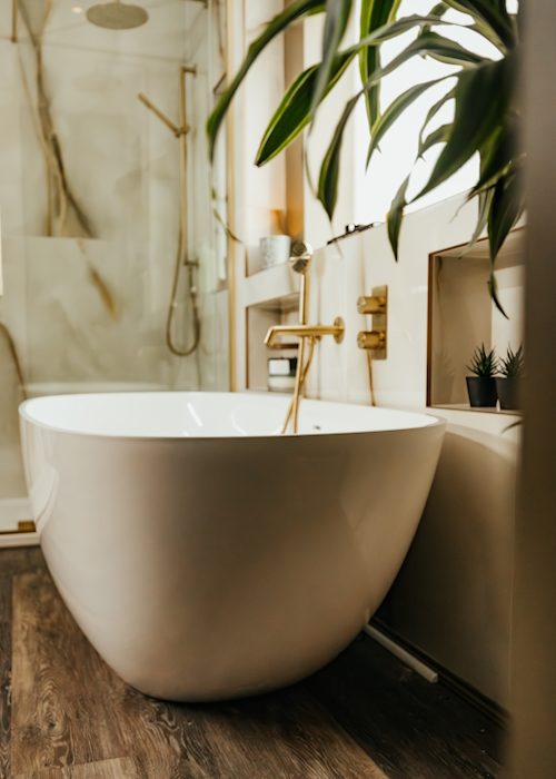 Positioned to take advantage of natural light and clear sightlines, the freestanding bath acts as the anchor of the space. Its soft, sculptural form introduces a sense of quiet luxury, contrasting beautifully with the architectural lines of the surrounding finishes.