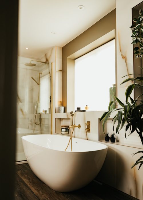 The completed bathroom is serene, tactile, and deeply considered. By combining a sculptural freestanding bath, intelligent WC technology, and a beautifully balanced vanity area, the design achieves a space that feels both indulgent and effortlessly functional.