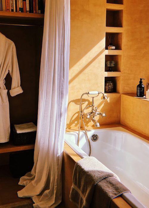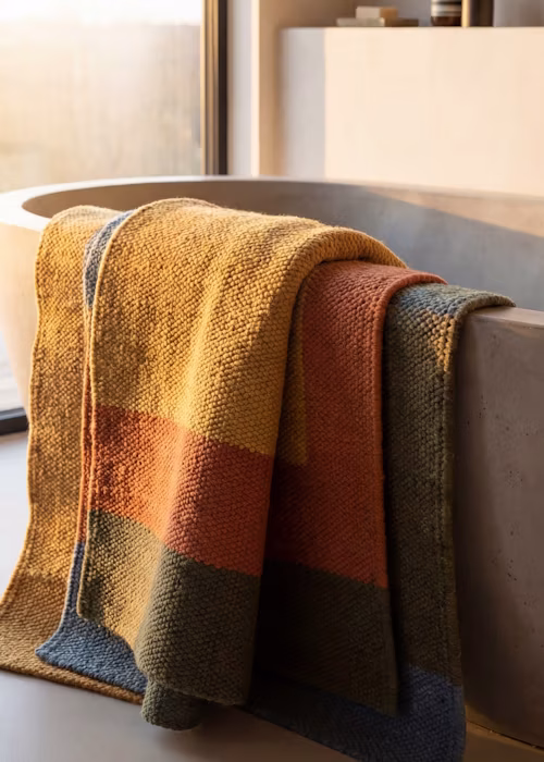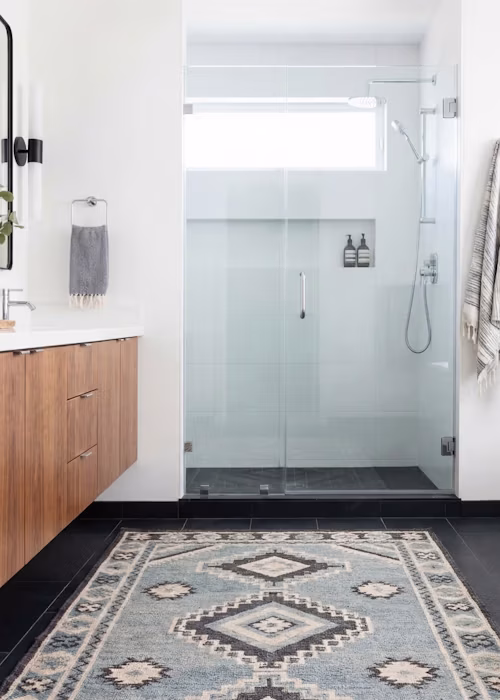 The same goes for rugs. Swap the bathmat for a flatweave or low-pile rug, such as an Egyptian or kilim-style design. They are practical, quick-drying, and instantly add warmth, texture, and character.
