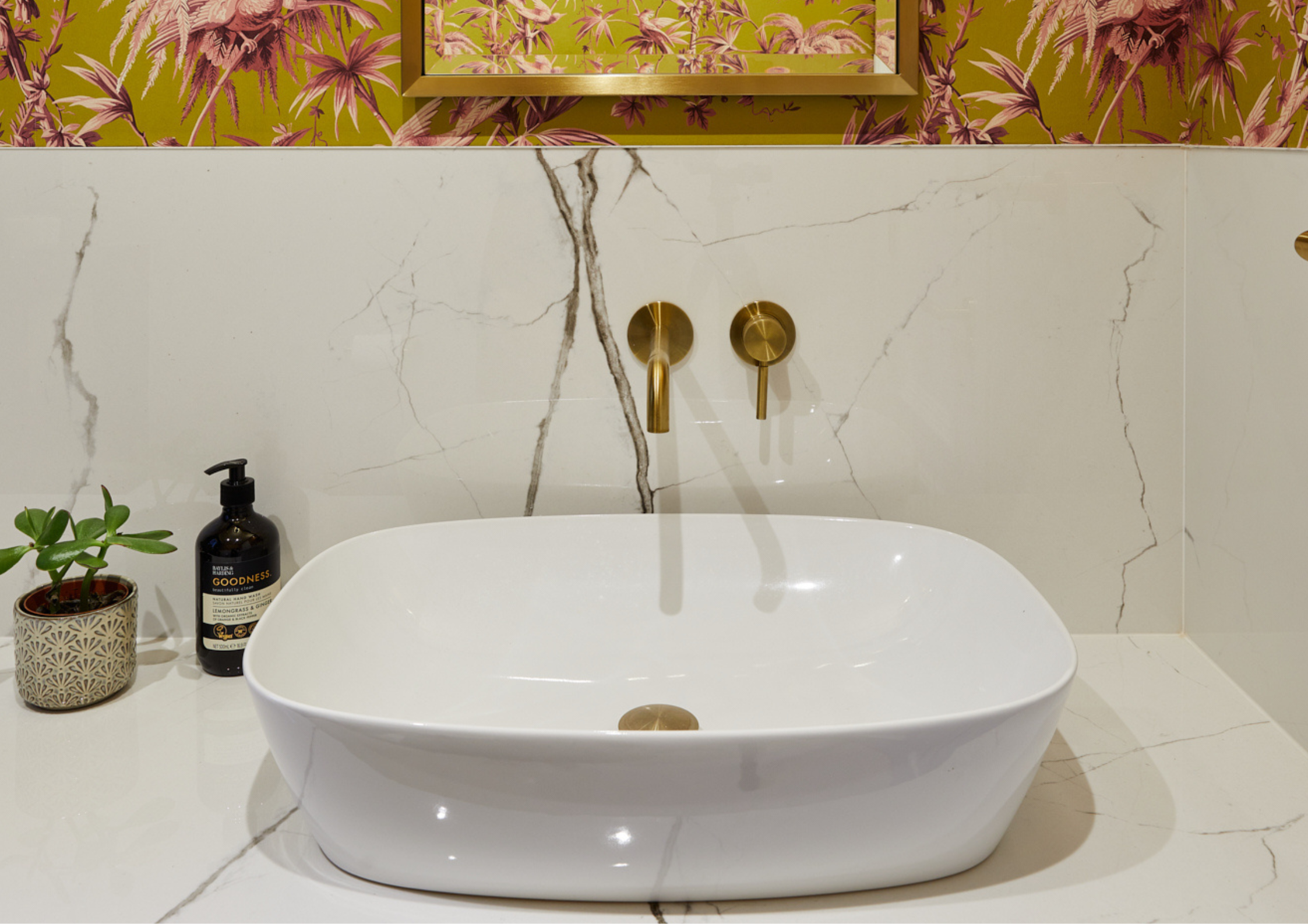 A vibrant yellow and pink designer wallpaper introduces warmth and individuality, perfectly complemented by brushed gold brassware and premium bathroom accessories for a luxurious, on-trend finish. This considered combination of bold pattern and clean, contemporary lines creates a boutique-style cloakroom design, a signature approach often seen in Kallums Bathrooms projects. Bespoke worktops and splashbacks in marble-effect porcelain tiles provide a seamless, high-end look, while offering excellent durability, low maintenance and long-lasting performance, ideal for modern bathroom design. Wall-hung sanitaryware and streamlined fittings maximise floor space, enhancing both functionality and the feeling of openness, making this small cloakroom design both practical and visually impactful.