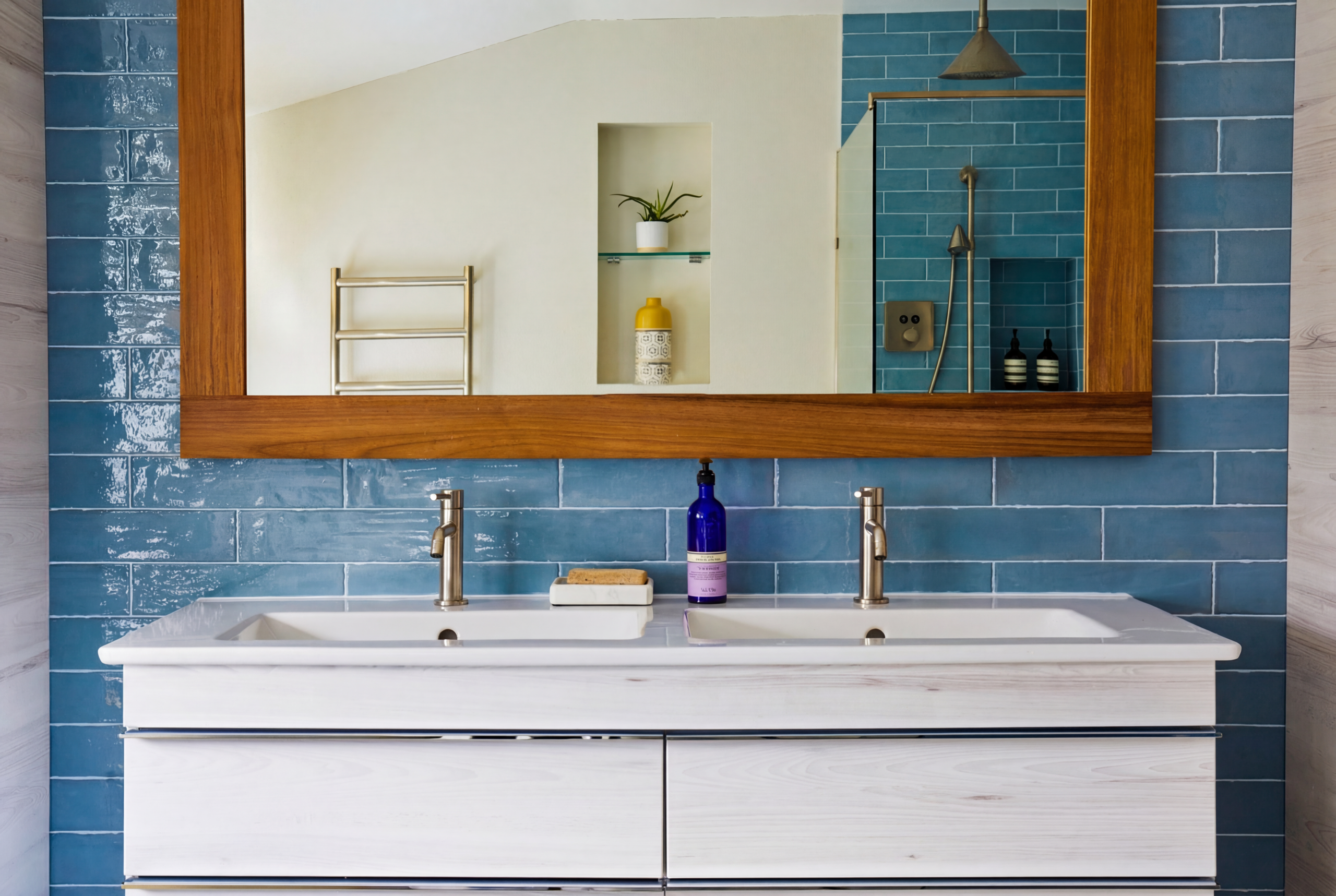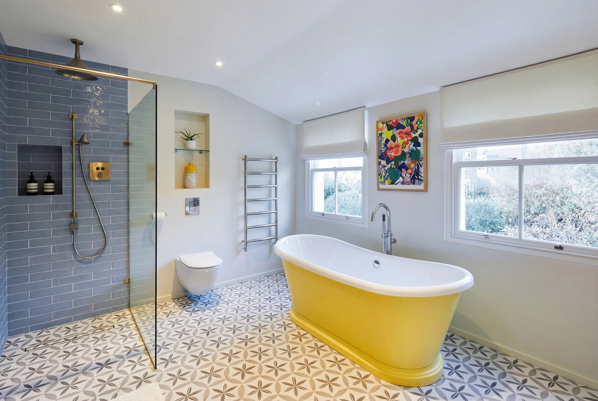 The completed space is a bright, airy retreat that feels both indulgent and welcoming. The yellow freestanding bath creates a stunning focal point, while the walk-in wetroom enhances the sense of openness. Smart storage within the vanity keeps the space uncluttered, supporting a clean and elegant finish. Delivered on time and within budget, this Barnes project reflects the craftsmanship and creativity of Kallums Bathrooms.
