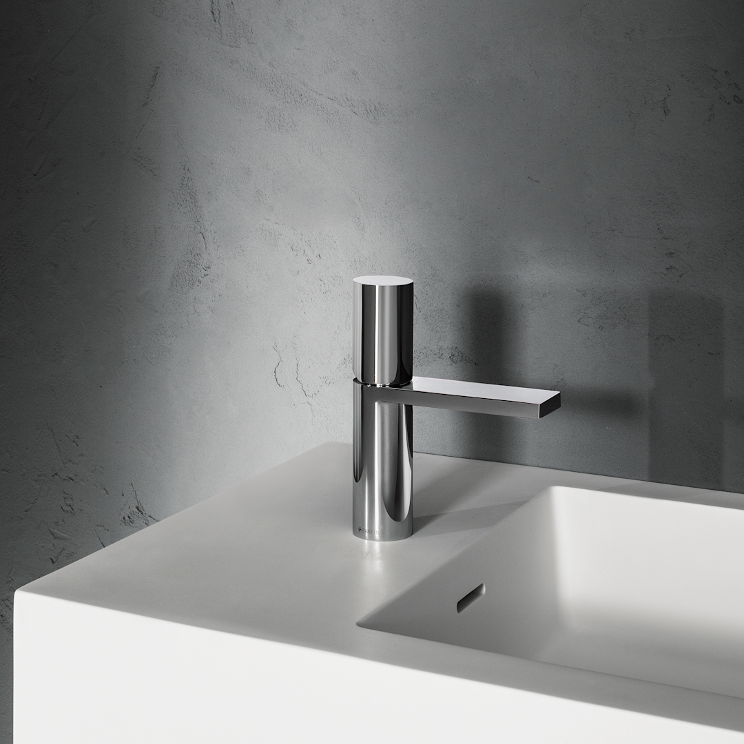 This Fantini basin mixer tap features a refined minimalist design that combines a cylindrical base with a slim, flat spout and single lever control. The clean geometric form creates a sleek architectural look, making it an ideal choice for contemporary bathroom spaces and modern basin installations.