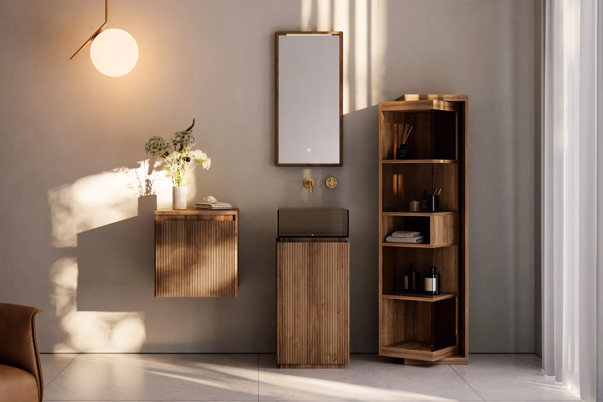 Plissé System is a contemporary collection of freestanding bathroom furniture from Italian brand Artelinea. With its pure, architectural lines and pleated vertical detailing, it brings warmth, texture and a touch of Italian design flair to modern bathrooms. The Groove walnut finish adds a rich, natural feel, while sleek tops and basins in glass or solid surfaces keep the overall look refined and luxurious. Designed as a modular system of storage units, counters and accessories, Plissé System works beautifully as a statement vanity or as part of a coordinated bathroom scheme.