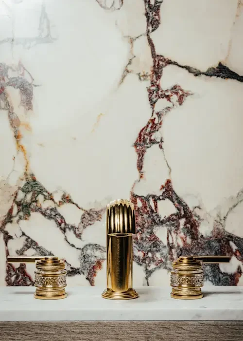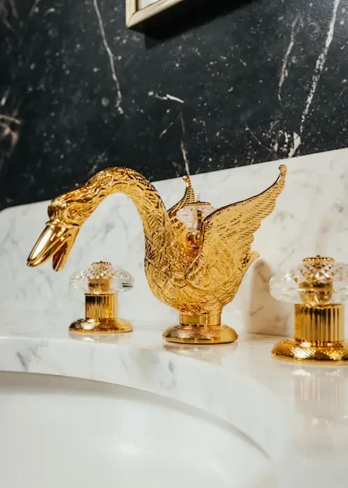Their portfolio reads like a design catalogue of texture and finish: brass mixers, crystal handles, obsidian accessories, patinated metals, gilding, and more. Behind each piece lies artisan technique, tactile richness and integrity.