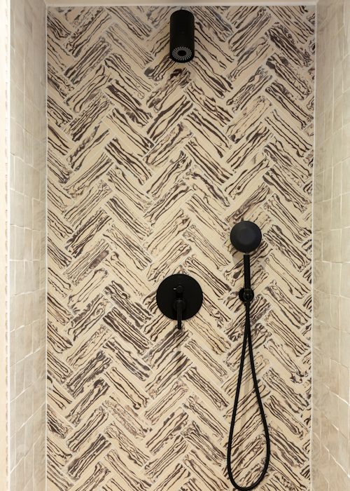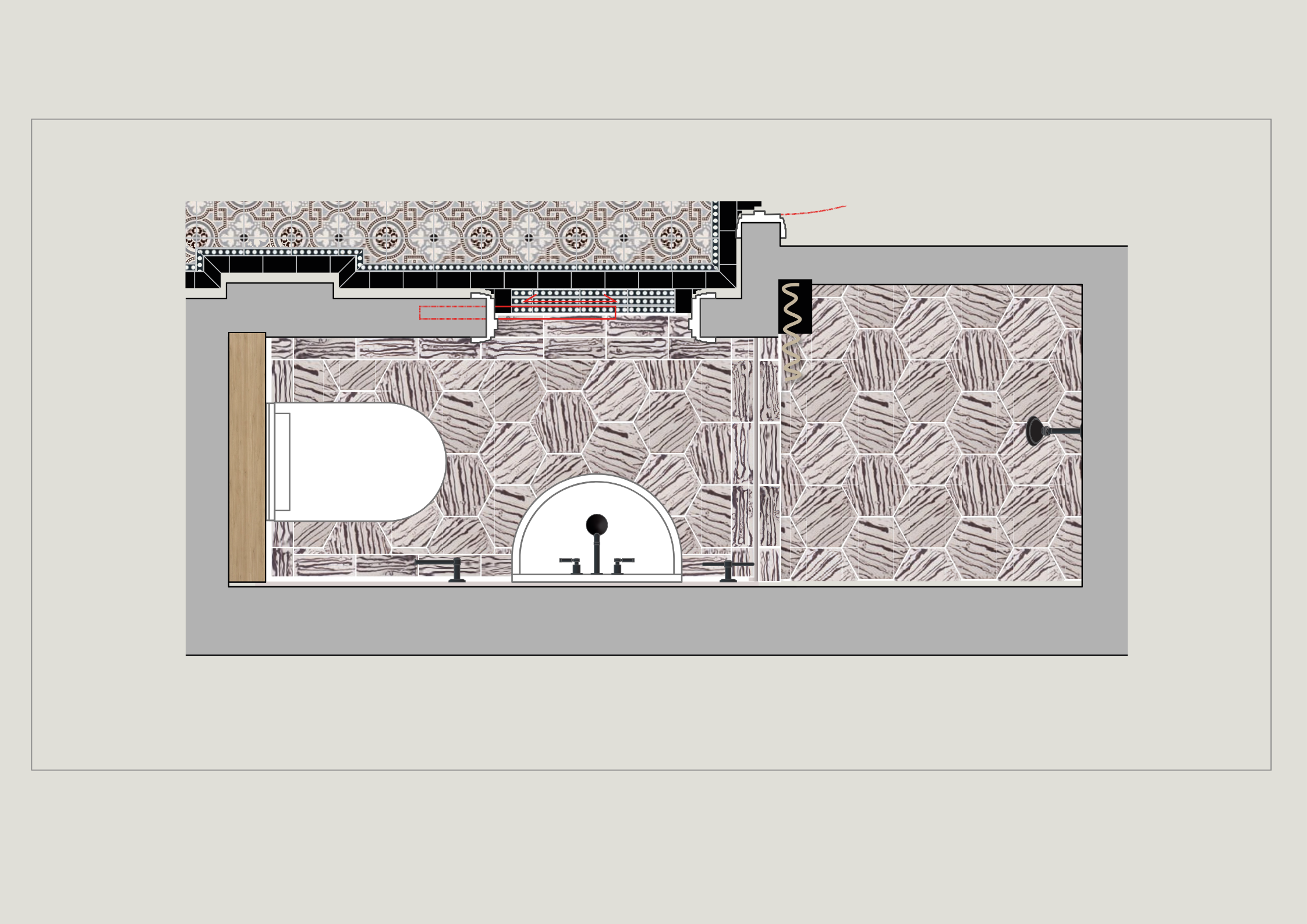 To support the Pooch Shower concept, the project incorporates a Unislope wet room system with an integrated linear drain, allowing the patterned tiles to flow seamlessly across the floor while ensuring effective drainage and waterproofing.