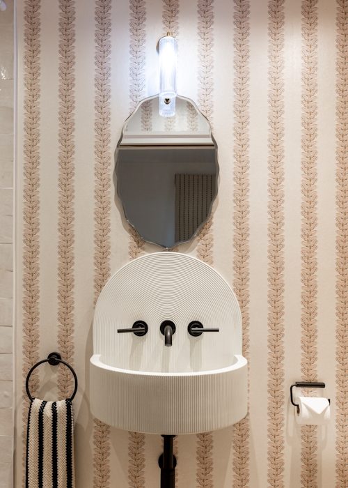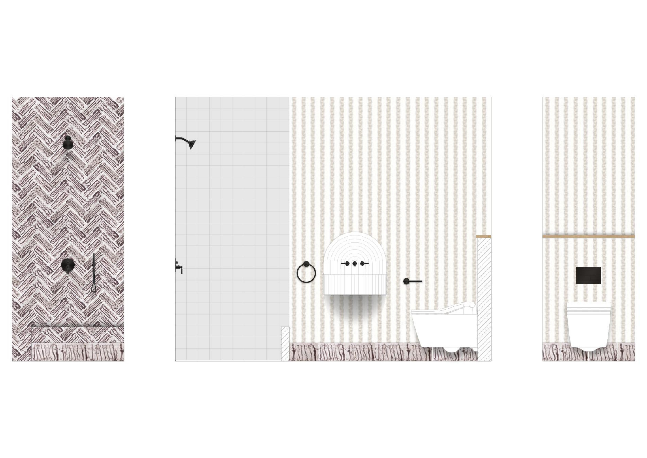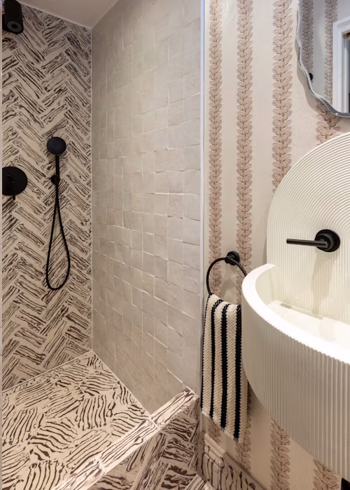 The patterned shower tiles introduce movement and depth, while the softer wallpaper brings warmth and elegance to the room. Dark matt black brassware provides a contemporary contrast against the lighter palette, tying the space together with a bold architectural edge.