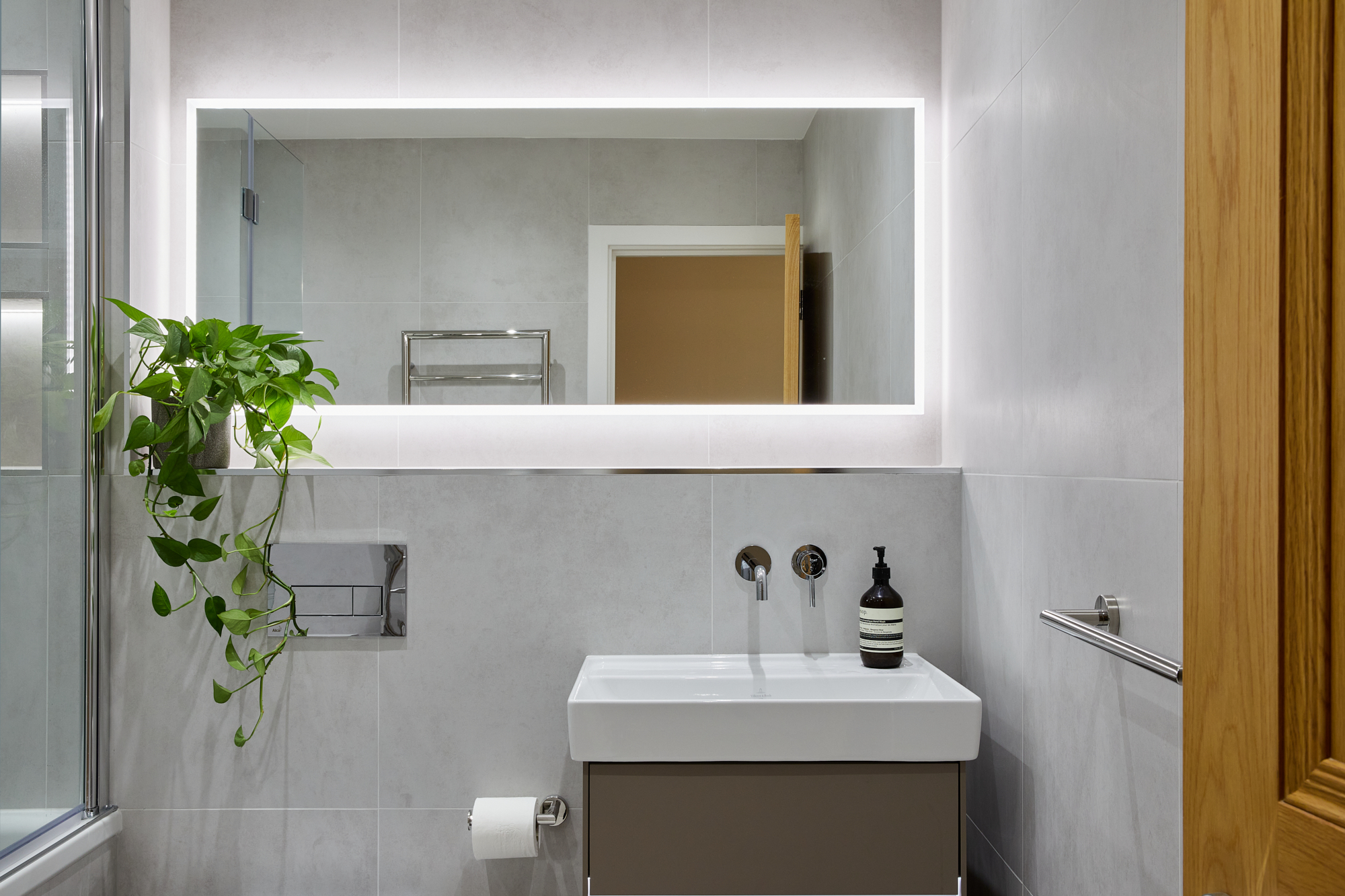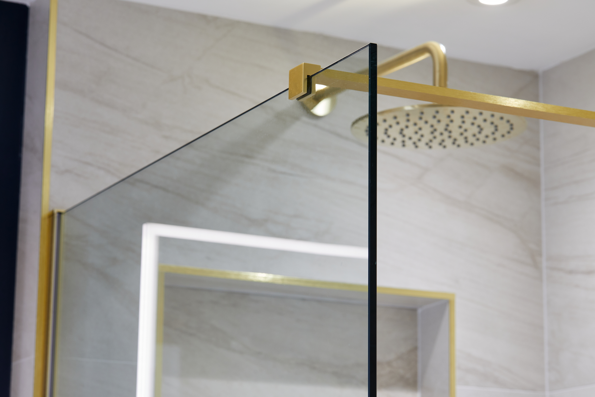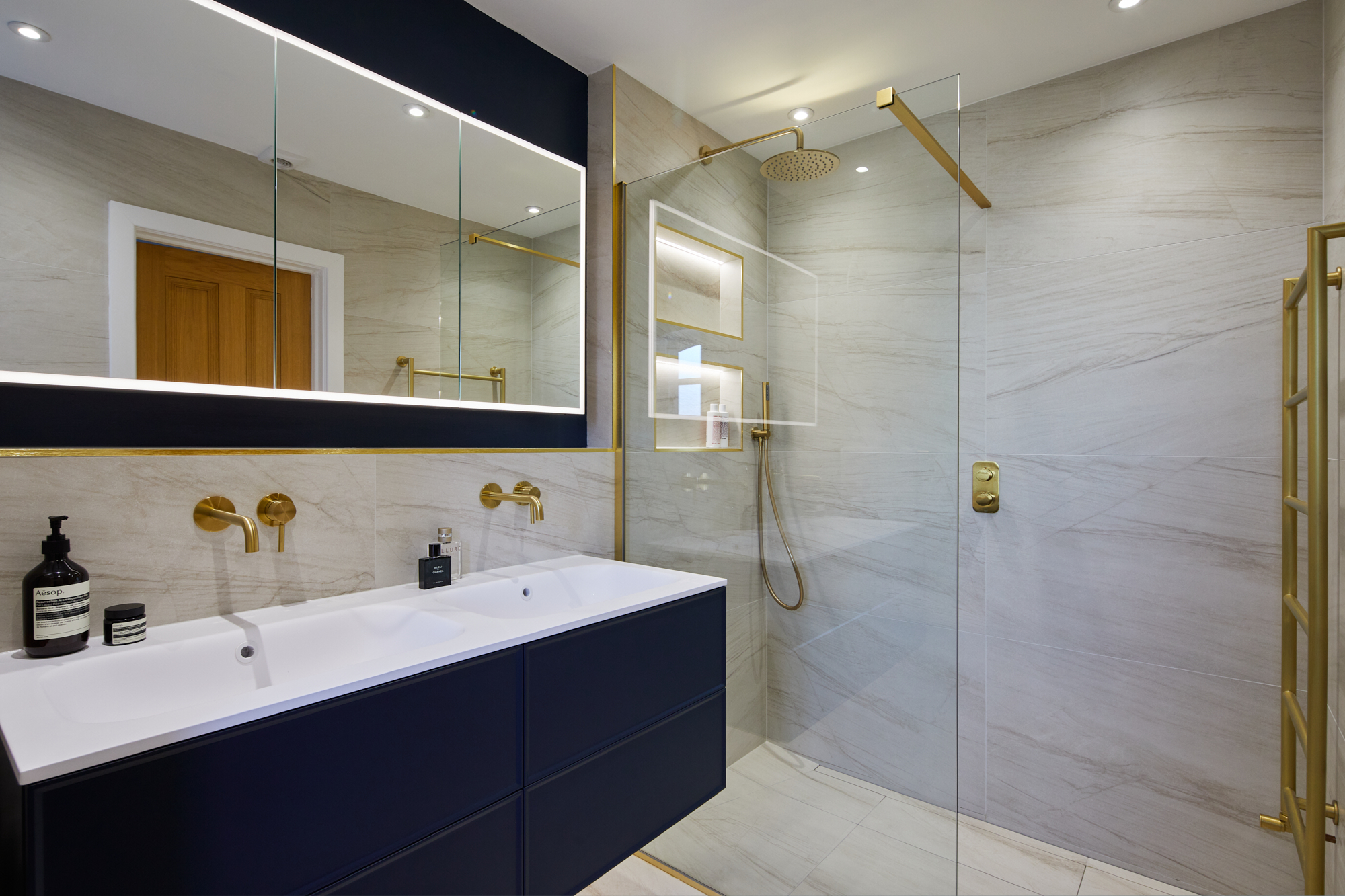 Brushed brass details add warmth and quiet elegance, while a sleek walk-in shower, integrated niche, and streamlined towel rail keep the space feeling considered rather than busy. A wall-hung toilet with concealed in-tank system solved layout challenges seamlessly, and layered LED lighting with a large mirrored cabinet completes the look.